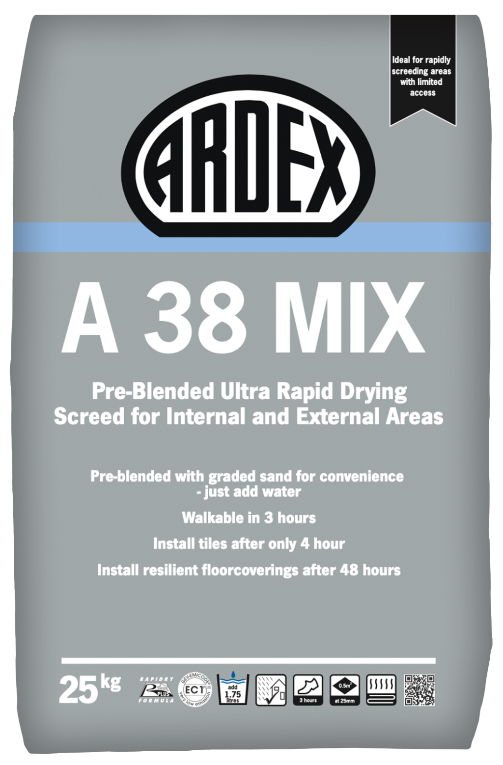 ARDEX A 38 MIX is a blend incorporating ARDEX A 38 cement and graded sands, and produces ultra-rapid drying floor screeds which can be walked on after just 3 hours and floorcoverings installed in as little as 4 hours, regardless of thickness. Use ARDEX A 38 MIX for bonded, unbonded and floating screeds in internal and external locations, including wet areas such as swimming pools.