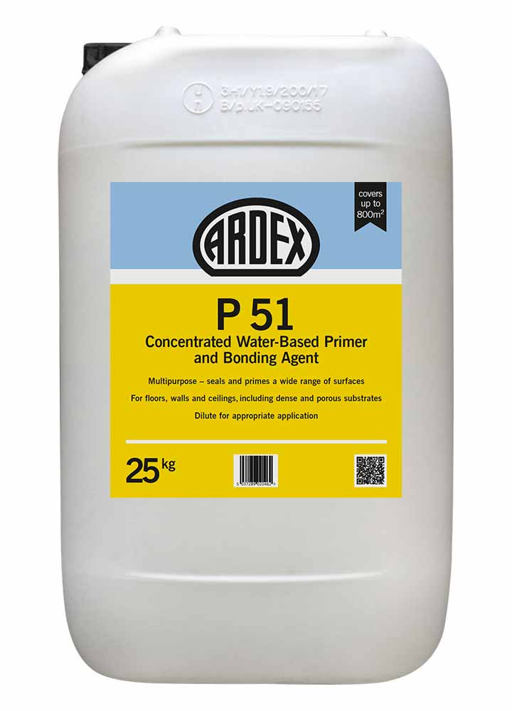 ARDEX P 51 is a multi-purpose primer ideal for priming porous surfaces prior to the application of ARDEX water-based levelling and smoothing compounds and wood based sheets and boards prior to the application of ARDEX X 7001 tile adhesive.